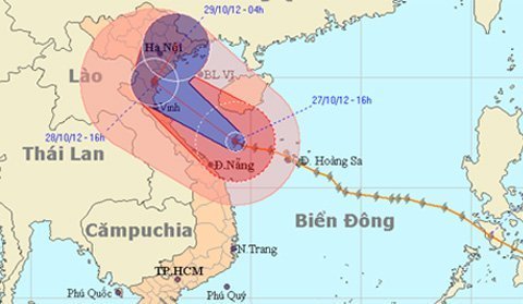 | Đường đi mới nhất của cơn bão số 8 vào lúc 16h ngày 27/10 |