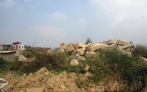 | Bê tông làm làm đường xếp đống, cỏ mục xung quanh. |