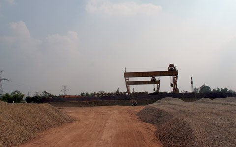 công rải rác với vài chiếc xe lu, xe xúc hoạt động.