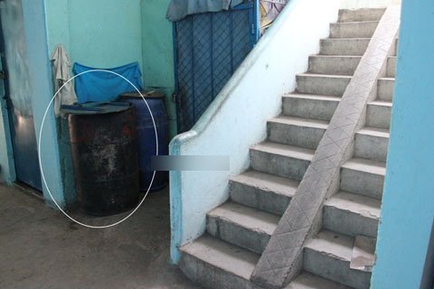 | Thùng rác ngay chân cầu thang trong khu nhà trọ, nơi phát hiện cháu bé sơ sinh bị mẹ vứt bỏ |