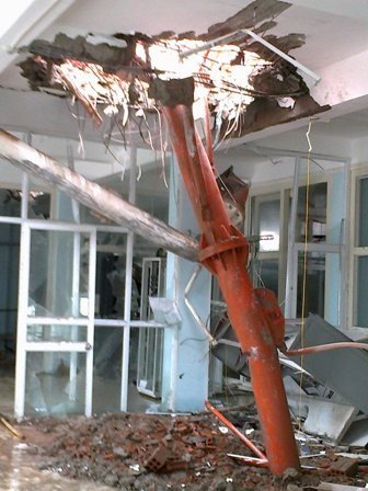 ![]() Vị trí tháp truyền hình bị đổ cách chân tháp chừng 20 mét đã “vặn xoắn tay áo” nên chỉ một phần thân tháp đè vào phần mái nhà của Tram phát sóng. ![]() Các điểm đứt gãy trên thân tháp truyền hình. ![]() ![]() Chiếc cột sắt chọc thủng mái của nhà phát sóng, xuyên vào bên trong phòng tầng 2 của toàn nhà mà không “động chạm” đến máy móc, thiết bị và nhân viên nhà đài đang trực ca. ![]() ![]() ![]() |