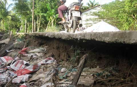 ![]() Cảnh báo nguy hiểm bằng cọc tiêu vệ đường. ![]() Người và phương tiện đi lại gặp nhiều khó khăn. ![]() Người dân chỉ vào đường biến thành bờ hàm ếch. ![]() Chống đỡ bằng cọc tre, gỗ tạm thời. ![]() Rất nhiều đoạn đường bị sụt lún, lộ hàm ếch trống rỗng. ![]() Mất 2/3 đường ven sông, người dân đi lại rất nguy hiểm. ![]() Đoạn đường nằm trong tình trạng báo động cực kỳ nguy hiểm. ![]() Thi công ì ạch, người dân đối mặt với rất nhiều hố tử thần ven sông. ![]() Bê tông, thép trộn lẫn với bùn đất. ![]() Hàng tấn sắt thép hoen rỉ, nằm nghiêng ngả giữa hoang tàn. ![]() Thi công chắp nối khiến người dân rất bức xúc ![]() |