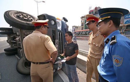 Lúc 11h trưa ngày 1/11/2012 tại cầu cạn trên cao gần khu vực ngã tư Khuất Duy Tiến và Nguyễn Xiển, một xe tải chở dầu rửa bát đâm vào dải phân cách và bị lật nghiêng.