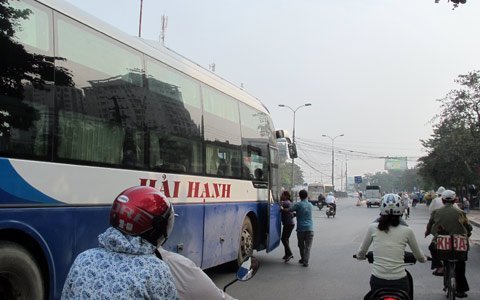 | Mặc dù đường Giải Phóng đã được phân làn nhưng xe khách vẫn bất chấp vi phạm |