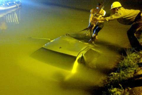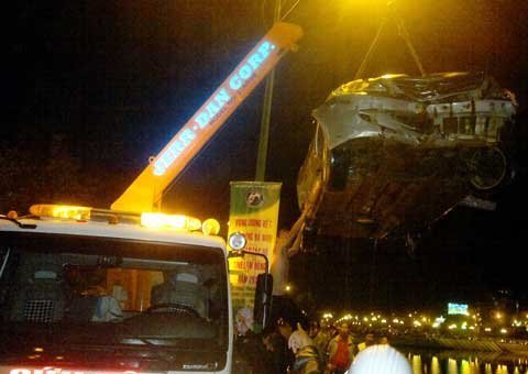 | Sau khi đâm vào 3 xe máy, chiếc ô tô lao thẳng xuống hồ Xuân Hương |