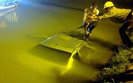 Sau khi đâm 3 xe máy, chiếc ô tô lao thẳng xuống hồ |