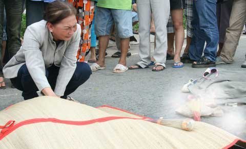 Xe chở xác đến. Dường như không muốn những thân nhân phải chứng kiến những hình ảnh xót xa, lực lượng CSGT đã tìm cách mời bố mẹ chồng nạn nhân và anh Cát đến một địa điểm xa hiện trường để lấy lời khai.
