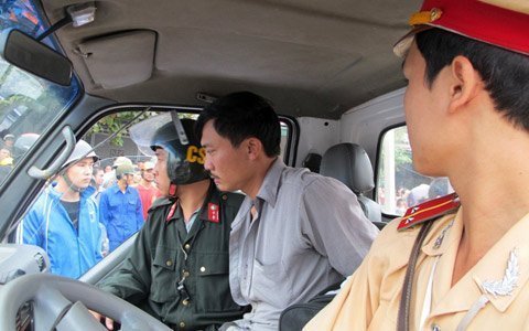 Khi bị chặn lại, 2 lái xe Vũ Xuân Quang và Lê Sĩ Tín (32 tuổi, trú tại Đắk Lắk) vẫn cố thủ trên xe, bất hợp tác với công an.