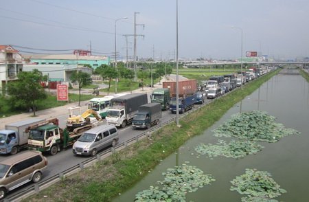 | Chiều lưu thông hướng về miền Tây trên quốc lộ 1A bị kẹt xe kéo dài |