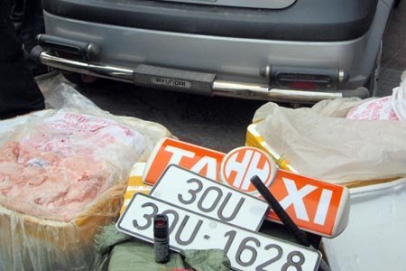 Tiến hành kiểm tra chiếc xe, tổ công tác còn phát hiện 1 bình xịt hơi cay và một biển số ô tô giả mang BKS 30U-1628, 1 bảng hiệu xe taxi.