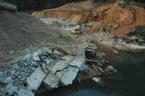 Công trình bờ đập lạnh tanh, vắng bóng bóng công nhân. Chỉ còn 2 chiếc máy đào đang hoạt động ở phía bờ bắc. Mảng tường bê tông phía thượng lưu con đập bị đổ sập, nằm chỏng trơ.