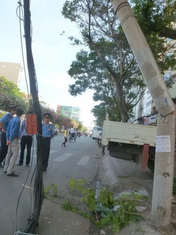 trên 4,5m đã lôi bó cáp ngang đường kéo gãy 3 trụ điện. Một trụ đập vào nhà 43