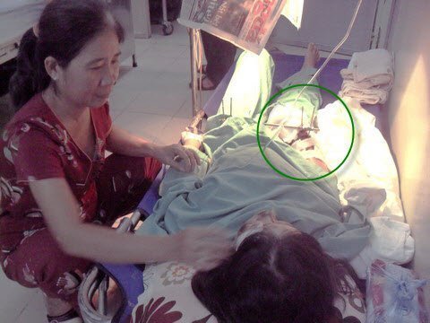 | Bà Cúc, mẹ Ngân đang chăm sóc con gái tại bệnh viện. Bàn tay phải của Ngân (trong vòng tròn) đang bất động. |