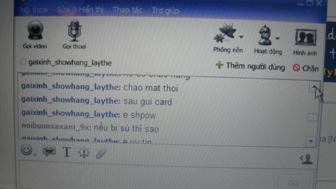 Những cửa sổ “chat room” hiện ra với khá nhiều nickname chỉ nhìn qua cũng biết chủ nhân của những nickname trên muốn gì, thích gì, như: Bochong_chatsex, Coithienđuong.., girlxinh_showhang_laythe..., kèm theo những lời mời gọi.