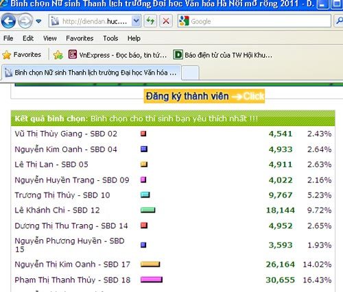 | Kết quả bình chọn thí sinh bạn yêu thích nhất trên forum Đại học Văn hóa |