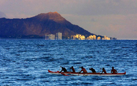 | Những người đàn ông đang chèo xuồng về phía bãi biển Waikiki. Đây cũng là môn thể thao rất được ưa chuộng của khách du lịch khi tới thăm Hawaii. |