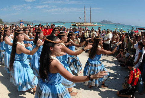 Vũ công Hula đang chào đón đoàn du khách tới thăm đảo. |