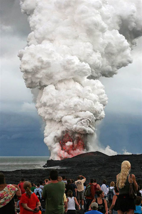 | Mọi người đang chiêm ngưỡng hình ảnh núi lửa Kilauea phun trào. Truyền thuyết kể rằng nữ thần núi lửa Pele đã đào hố lửa khi đi từ đảo này sang đảo khác để tìm kiếm ngôi nhà cho các anh chị em mình. Và cuối cùng cô đã chọn núi Kilauea làm nơi để người thân sinh sống. |