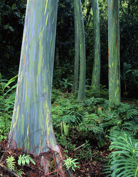 | Những cây bạch đàn cầu vồng tại Keanae mỗi năm lại lột lớp vỏ đen một lần để lộ ra thân cây đầy màu sắc. |