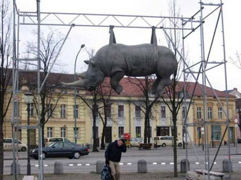 Chú tê giác được treo lên cao ở Potsdam, Đức.
