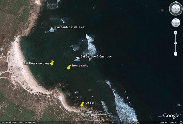Để khỏi mất thời gian và sức lực (vì bãi này cũng khá rộng) mọi người xem sơ đồ khu vực rạn san hô dưới đây để biết địa điểm rạn san hô (độ sâu ước tính theo mực nước triều thấp).