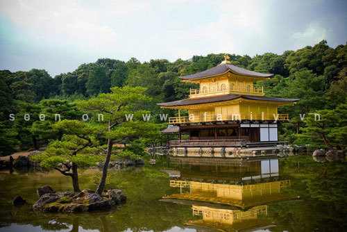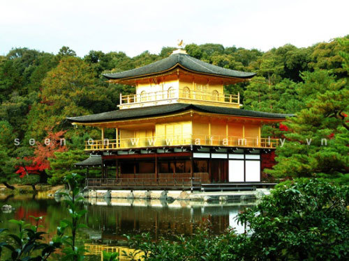 Được xây dựng như một nơi nghỉ dưỡng cho Tướng quân Ashikaga Yoshimitsu vào cuối thế kỷ 14. Vào năm 1950, ngôi chùa đã bị thiêu rụi bởi một nhà sư trẻ tuy nhiên nó đã được xây dựng lại theo đúng nguyên mẫu ban đầu rồi dát lại vàng vào năm 1955.