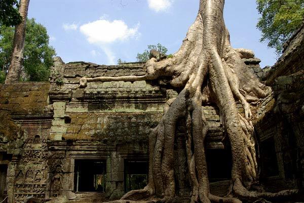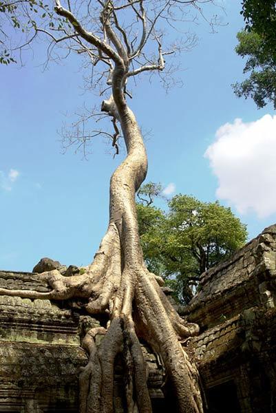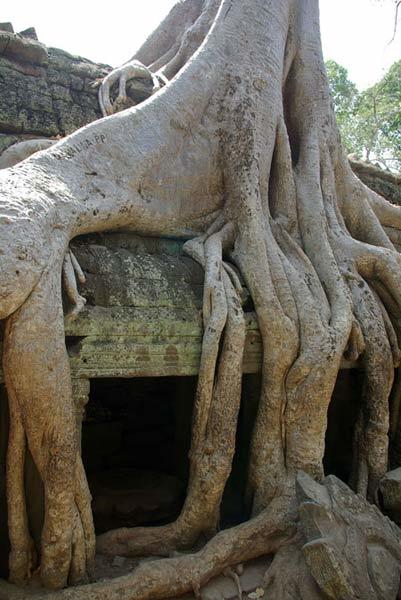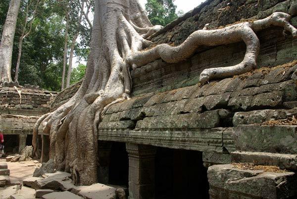 Cây ở đây được hình thành trên nguyên tắc hạt nẩy mầm trên mái đền. Qua thời gian, bộ rễ của chúng phát triển kỳ dị bám chặt lấy các ngôi đền. Chúng phá huỷ ngôi đền nhưng đôi khi nhờ những bộ rễ cây mà ngôi đền còn tồn tại cho đến ngày nay.