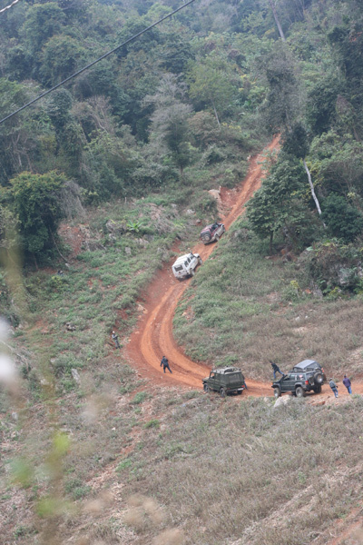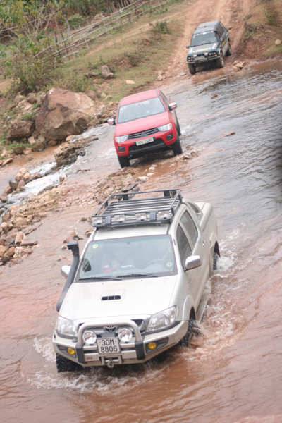 Lên dốc, xuống đèo, rồi vượt suối, các xe vẫn nối đuôi nhau chầm chậm qua.