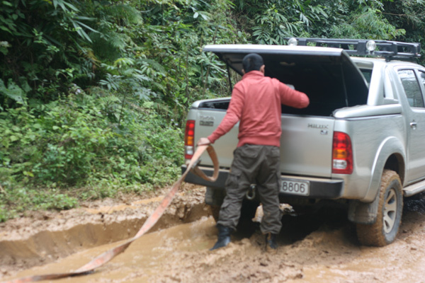 Cả đoàn bỗng khựng lại. Một “chiến mã” sa lầy vì đường trơn. Chiếc lốp cứ