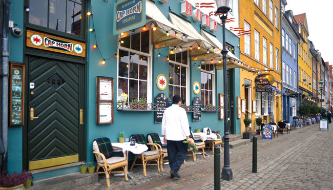 | Vỉa hè đường Nyhavn với những quán bia nổi tiếng ở Copenhaghen. (Ảnh: SGTT) |