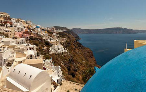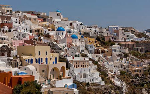 Đến Santorini, bạn có thể ghé thăm hai thị trấn Fira và Oia. Nếu Fira là nơi tuyệt vời để lưu giữ lại khoảnh khắc khi hoàng hôn buông xuống thì phong cách kiến trúc ở Oia lại cực kỳ ấn tượng. Những ngôi nhà nhỏ xinh nằm trên những ngọn đồi thoai thoải, lô xô nhau đứng chênh vênh hướng ra biển. Tất cả đều được sơn màu trắng tinh khiết kết hợp với sắc xanh của màu nước biển Địa Trung Hải điểm xuyết nơi mái vòm, cửa sổ, tạo nên một tổng thể sắc màu hài hòa cùng thiên nhiên.