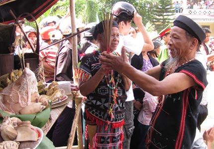 | Các vị già làng làm lễ trước khi đâm trâu |