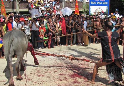 Trong khi đó, 300 người đánh cồng chiêng, thổi khèn bè, nhảy múa, ca hát, biểu diễn võ thuật... Đây là linh hồn của lễ hội. Chứng kiến từng nhát dao đâm vào con trâu và khi trâu gục ngã sau 40 phút bị hành quyết, nhiều người xem cảm thấy nghẹt thở và xót xa.