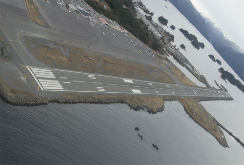 | Sân bay Stika Gutierrez (Alaska, Mỹ) nằm trên hòn đảo nhỏ của Japonski. Đường băng bị nước bao quanh. |