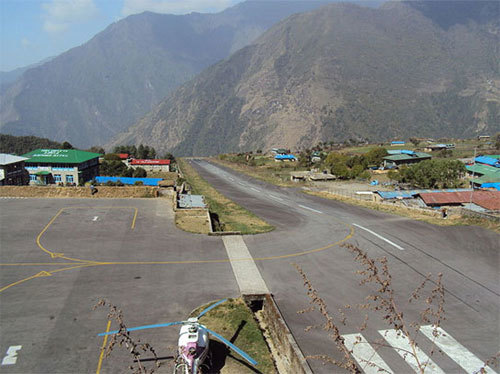 | Sân bay Tenzing Hillary (Lukla, Nepal) nằm trên đỉnh núi phủ tuyết Himalaya. Đường băng chỉ dài 457m chạy dọc sườn núi. |