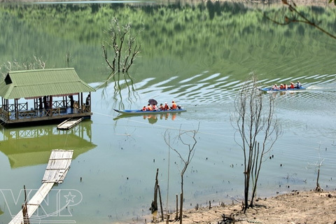 | Mặt hồ Định Bình phẳng lặng, du khách đi ca nô, lướt nhẹ giữa lòng hồ, tận hưởng không khí trong lành. |