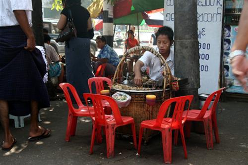 Những gánh xe hàng nghi ngút khói bốc lên từ nồi nước dùng, xe trisaw (xe đạp chở khách có hai ghế ngồi lệch một bên) với những người đàn ông gầy gò và đen sạm trong chiếc váy longyi truyền thống, đi loanh quanh từ góc phố này đến góc phố kia chỉ hết có 500 chạt (tương đương 10.000 đồng).