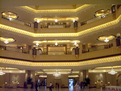 Nói về nội thất, trong lòng Emirates Palace là một thế giới cung điện khổng lồ với những nét xa hoa, lộng lẫy từ những ánh đèn trang trí đến những mái vòm được nạm vàng và đá cẩm thạch.