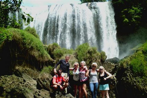 Du khách nước ngoài chụp hình bên dưới thác Voi