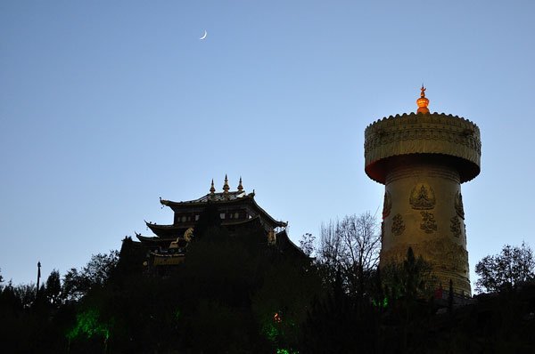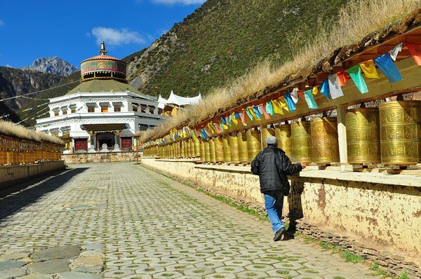 Trong sân chùa, sừng sững một chuyển pháp luân kinh khổng lồ cao 24m. Người Tạng tin rằng cùng với niệm phật và quay chuyển pháp luân thì những lời cầu nguyện sẽ dễ dàng lên được đến trời.