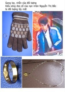 Cơ quan công an còn thu được chiếc nhẫn giống như nhẫn cưới, trơn và mới, có đính đá của tên sát nhân. Chiếc nhẫn có ký hiệu 18K RGP tên sát nhân đưa bà Bắc định bán.