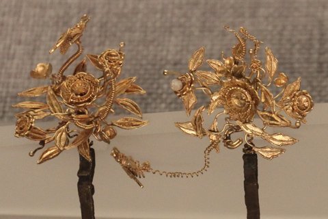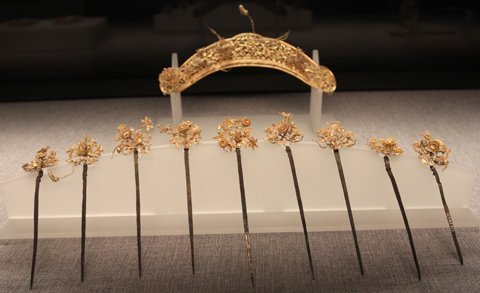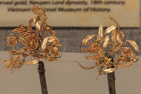 Bộ Trâm cài đầu nạm vàng và bạc thời Chúa Nguyễn thế kỷ 18 với 9 chiếc trâm cài đầu không chiếc nào giống nhau với hoa văn rồng phượng uốn lượn.