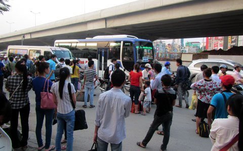 Hàng trăm người đứng dưới lòng đường Nguyễn Xiển đón xe khách về quê