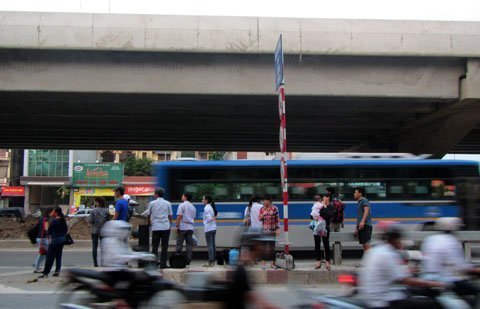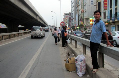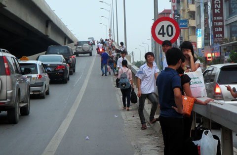 Vào các buổi chiều, hình ảnh quen thuộc là cảnh hàng chục người (những ngày cuối tuần có cả trăm người) đứng giữa đường đón xe, thậm chí người dân còn ngồi vắt vẻo trên lan can đường dẫn để chờ xe.