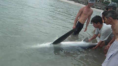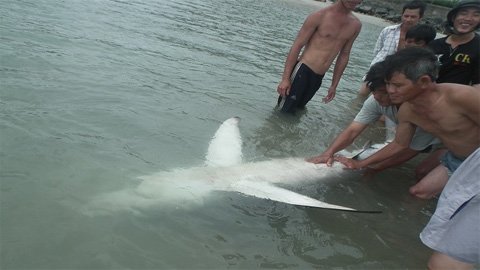 | Rất nhiều người dân tới xem muốn được tận tay sờ vào cá mập. Con cá mập này có chiều dài khoảng 2m và nặng gần 100kg. |