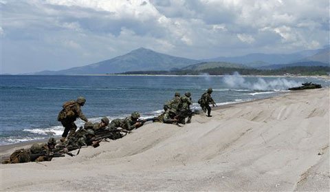 | Lính thủy đánh bộ của Mỹ và Philippines đã diễn tập tấn công đổ bộ trên bãi biển. Ảnh: kansascity |