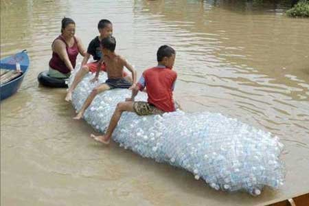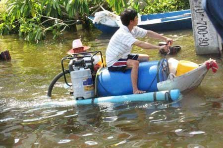 Thuyền tự chế từ thùng nước và các thiết bị gia dụng khác.