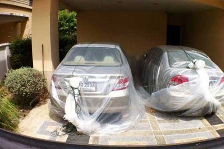 Nilông không chỉ dùng để gói hoa quả mà nó còn được đem bọc ô tô tránh nước
