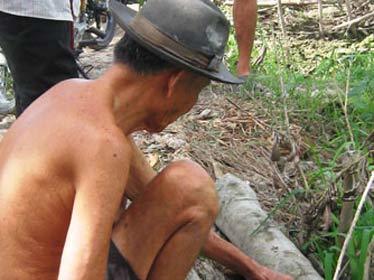 Ông Năm chỉ vào những vết thâm trên thân cây cau và khẳng định đó là vết máu chảy ra khi bị cháu ông chém. (Ảnh: Pháp luật TP.HCM)