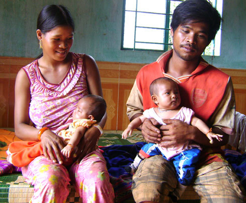 Vợ chồng anh Siu Droch và hai cô con gái song sinh.